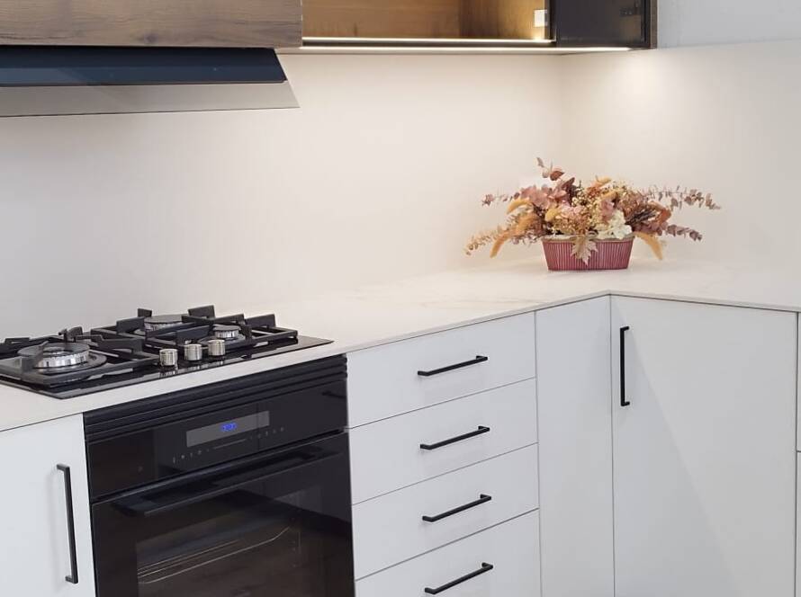 Cuina fabricada en Melamina blanca i Perfect Sense Roure Halifax Castany .